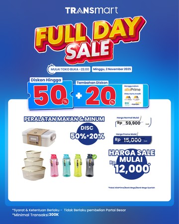 Transmart Full Day Sale hadir pada 2/11 dengan diskon hingga 50% + 20% untuk berbagai produk. Nikmati promo menarik dan harga mulai Rp 12.000-an!