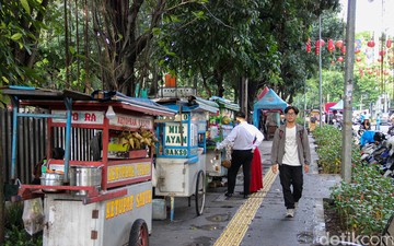 Trotoar Lapangan Banteng kembali dipenuhi PKL saat Ramadan. Pengawasan dinilai lemah dan ruang pejalan kaki pun menyempit.