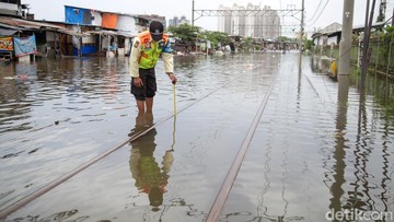 Banjir menggenangi rel kereta di Kampung Bandan, Jakarta. Perjalanan KRL menuju Tanjung Priok dihentikan sementara demi keselamatan penumpang.